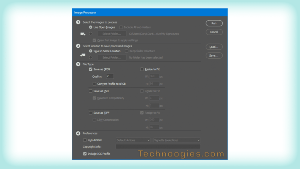 Some settings in the Image Processor dialog need to be considered before running the process.